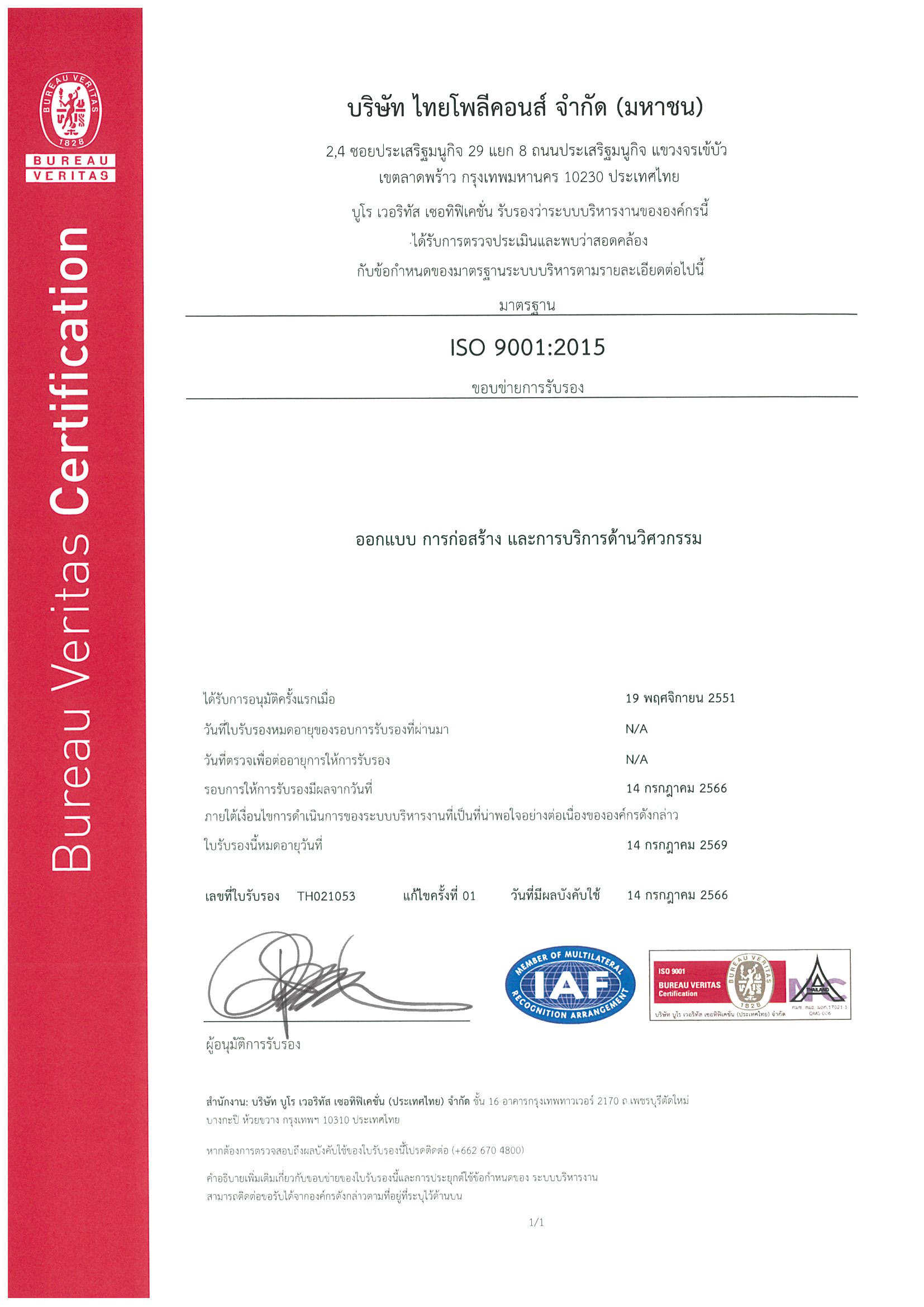 บริษัท ไทยโพลีคอนส์ จำกัด (มหาชน) ได้รับการรับรองมาตรฐาน ISO 9001:2015 จาก สถาบัน BUREAU VERITAS Certification ในด้านระบบการจัดการด้านคุณภาพสำหรับ ออกแบบ การก่อสร้าง และการบริการด้านวิศวกรรม เมื่อวันที่ 19 พฤศจิกายน 2551 และยังรักษามาตรฐาน ระบบคุณภาพ ISO 9001:2015 อย่างต่อเนื่อง มีผลบังคับ ณ วันที่ 14 กรกฎาคม 2566 เพราะบริษัทฯ ให้ความสำคัญและความใส่ใจในคุณภาพงานที่มีต่อลูกค้า